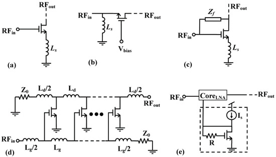 Basic LNA topologies: (a) Common source; (b) common gate; (c) CS with impedance feedback; (d) distributed LNA; (e) active inductor LNA.