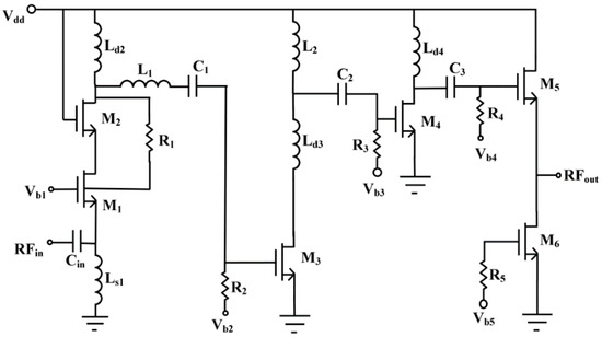 The Federal Communications Commission (FCC), in 2002, offered a 3.1–10.6 GHz ultra-wideband frequency (UWB) range, for the implementation of very high data rate wireless communication links [1]. The FCC set an upper limit on highest power spectral density to −41.3 dBm/MHz over the 3.1–10.6 GHz frequency range, so that the newly designed wireless communication devices could not interfere with the wireless services existing in the same local area network [1,2,3]. This upper limit for power spectral density makes the UWB technology suitable for many interesting wireless applications, such as wireless personal area networks (WPAN), medical imaging, short-range radars for vehicles and wireless sensor nodes [4,5]. It gives reasons for low-power very-large scale integration (VLSI) design industries and researchers to develop low-power, low-noise, and reliable UWB radio-frequency integrated circuits (RFICs) for these applications. Moreover, continuous shrinking in complementary metal oxide semiconductor (CMOS) chip fabrication technologies and split manufacturing techniques in RF designs [6,7], makes it possible to design and fabricate RFICs on the nanometer scale [8,9].