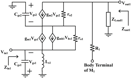 where gm1, gm2 are transconductances and 1/ro1, 1/ro2 are drain-to-source channel conductance of M1 and M2 respectively. Back-gate transconductance of M1 is denoted by gmb1 and ZLoad1 is the total load impedance connected at the drain of transistor M2. In Equation (3), assuming ro1 >> 1 and ro2 >> 1, then at the input parallel resonance condition set up by Ls1 and Cgs1 and the input impedance Zin(ω) can be approximated as: