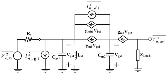 where , and are the rms output noise voltages at the drain terminal of M2 due to , and , respectively. The , and can be expressed as: