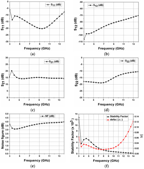 (a) S11 vs. frequency, (b) S12 vs. frequency, (c) S21 vs. frequency, (d) S22 vs. frequency, (e) NF vs. frequency, and (f) stability factor (K) and magnitude of delta (|Δ|) vs. frequency.