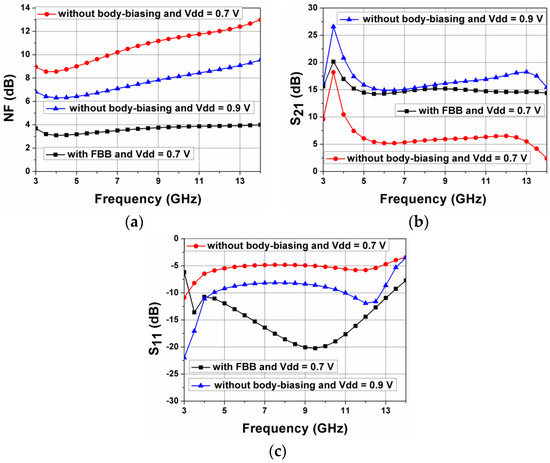 Frequency response with feedback body bias and without body-bias. (a) NF vs. frequency, (b) S21 vs. frequency, and (c) S11 vs. frequency.