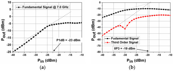 Another significant parameter to be considered is linearity. The input signal received from the antenna must be linearly amplified by the designed LNA. As LNAs are usually biased at a very low voltage, at this low voltage the linearity survives due to transconductance (gm) and drain-conductance (gds) nonlinearities of the MOS device. Linearity of the proposed LNA has been analyzed graphically in terms of a 1-dB compression point (P1dB), and a third order interface point (IIP3) for which input power was swept from −40 dBm to −10 dBm. It can be observed from Figure 7a that P1dB at the fundamental frequency of 7.0 GHz was −23.0 dBm. A two tone test was performed at a center frequency of 7.0 GHz that gave two tones at f1 = 6.995 GHz and f2 = 7.005 GHz with frequency spacing of 10 MHz to find IIP3. Extrapolating the fundamental signal and third order signal outputs and finding out the intersection of the two gives the approximate value of IIP3. It can be observed from Figure 7b that IIP3 of the proposed LNA was −19 dBm.
