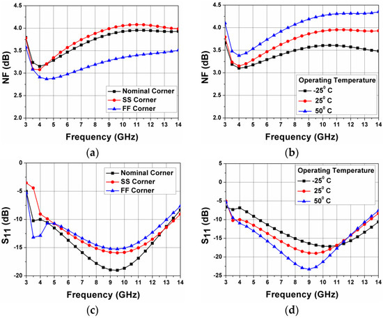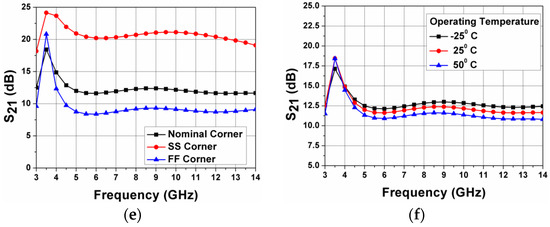 The designed UWB LNA must be stable against temperature variations. To ensure this, the designed LNA was simulated at nominal, slow-slow (SS), and fast-fast (FF) process corners and at different temperatures of −25°, 25° and 50° Celsius (Figure 8). It can be observed from Figure 8a,b that the feedback of the proposed UWB LNA had a minimum NF that varied from 2.87–3.75 dB to 3.0–4.0 dB at the FF and SS corners respectively, and it varied from 3.1–3.6 dB to 3.3–4.3 dB for −25 °C to −50 °C temperature variations, respectively. Figure 8c,d shows the frequency responses of the input reflection coefficient against process and temperature variations. It can be observed that S11 was less −9.0 dB for 4–13 GHz for all process corners, and was less than 9.1 dB for 5–13 GHz for the temperature range of −25 °C to 50 °C. The power gain frequency response of the proposed LNA is shown in Figure 8e–f, which confirmed the robustness of the proposed UWB LNA against temperature variations.