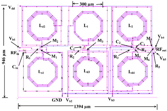 Results in this study were obtained with theoretical calculations and simulations with standard model files in 90 nm technology. The chip-layout of the proposed LNA is shown in Figure 9, which is designed using the Cadence Layout tool using a 90 nm CMOS process. The dimensions of all the inductors have been calculated using the expression from Mohan et al. (1999) [24]. All the inductors have been designed using metal-1 layer with a turn width and turn spacing of 5 µm and an outer diameter (Dout) of 300 µm for each. As the designed LNA is required to achieve a large bandwidth, the Q-factor of the inductors used in the proposed LNA was very small and ranges from 0.6–1.5. The capacitors Cin and C1 were designed using metal-insulator-metal using metal-2 and metal-3 layers. The capacitors C2 and C3 were designed using a N-type MOS device, whereas the N-diffusion resistors were used to decrease the layout area. The chip layout occupied 1.318 mm2 of area. In order to evaluate and compare the overall performance of the proposed UWB LNA with previous work, a figure-of-merit (FOM) has been evaluated. The figure-of-merit can be obtained as [14,22,23]: