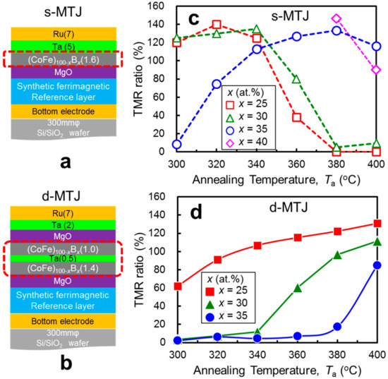 To obtain high thermal tolerance, one needs to control diffusion of boron from CoFeB to the adjacent layer because boron concentration plays a crucial role in realizing perpendicular easy axis [18,19,20,21,22,23,24,25,26,27,28,29,30,31,32,33]. As shown in Figure 2a,c, all the s-MTJs showed an increase of TMR ratio up to a specific temperature, above which the TMR ratio degraded. The annealing temperature (Ta) where the maximum TMR ratio is observed in the s-MTJs increases with increasing x up to 35at%B. In s-MTJ with x = 40at%B, the TMR ratio drastically decreases at Ta = 400 °C, which may be related to the formation of a weak (001) texture in MgO/CoFeB stack with high B concentration [30]. On the other hand, as shown in Figure 2b,d, the TMR ratio of d-MTJs increases monotonically as Ta increases up to 400 °C. In d-MTJ with x = 25at%B, TMR ratio reaches to 131%. As x increases, higher Ta is required in order to get a higher TMR ratio. As seen above, the temperature dependence of TMR ratio in d-MTJ is significantly different from that in s-MTJ [29].