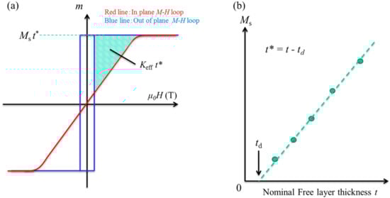 In the CoFeB/MgO-based p-MTJ system, effective anisotropy energy density Kefft* is determined by competition between interfacial anisotropy Ki and shape anisotropy (−Ms2/2µ0 where MS is saturation magnetization), as expressed in Equation (1).