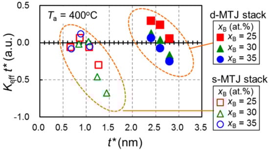 Kefft* as a function of t* for s-MTJ and d-MTJ with B content of 25–35at.% annealed at 400 °C.