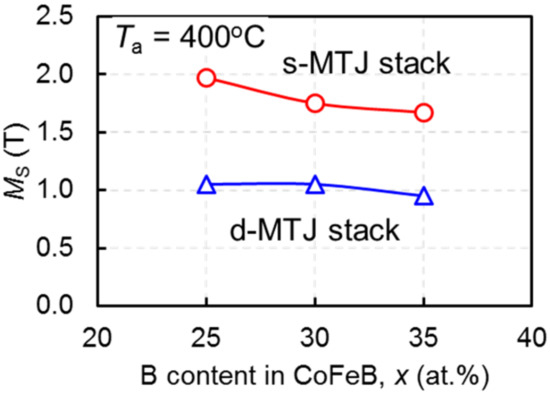 From this measured Ms and Equation (1), in the s-MTJ, shape anisotropy is the dominant factor that determines perpendicular anisotropy because of larger Ms (larger shape anisotropy). On the other hand, in the d-MTJ, Ki is the dominant factor because of smaller Ms and larger Ki (about double that of s-MTJ thanks to double CoFeB/MgO interface). In order to improve perpendicular anisotropy, larger Ki and smaller Ms are desirable. However, with increasing B content in CoFeB, both Ms of CoFeB and Ki decreases [21].