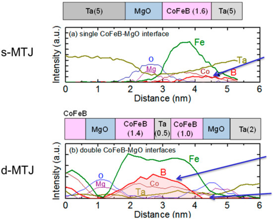 The large difference in Ms between s-MTJ and d-MTJ is due to the difference in B diffusion state. As shown in Figure 6, the boron in the s-MTJ adsorbs into the Ta-capping layer. On the other hand, boron in the d-MTJ is located around the Ta insertion layer. The Ta insertion layer acts as a boron absorption layer. Also, the MgO-capping layer blocks boron diffusion from the CoFeB to the Ta-capping layer. As a result, in the d-MTJ, a large amount of boron remains in the CoFeB layer. This results in lower Ms in the free layer of d-MTJ than in that of s-MTJ. These results indicate that boron composition of the CoFeB layer after annealing is a critical factor to realize thermal tolerance for annealing at a temperature of 400 °C, which is a standard requirement for the integration with CMOS in back-end-of line process.