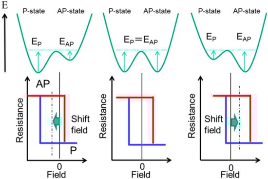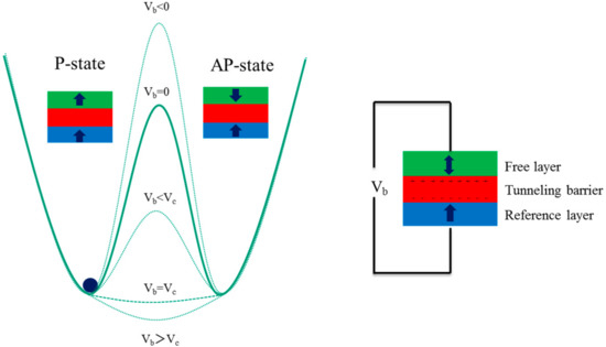 Figure 12 illustrates the writing operation principle of voltage-controlled MRAM VC-MRAM. In VC-MRAM, a magnetic anisotropy modulation by electric field (voltage) is utilized. By applying the external voltage Vb, the interfacial perpendicular magnetic anisotropy of the p-MTJ is modulated [87], resulting in the change of energy barrier depth between P and AP state. When Vb is negative (positive), interfacial perpendicular anisotropy increases (decreases). At above threshold voltage, precessional switching can be achieved under magnetic field.