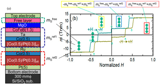 - Sato, H.; Ikeda, S.; Fukami, S.; Honjo, H.; Ishikawa, S.; Yamanouchi, S.; Mizunuma, K.; Matsukura, S.; Ohno, H. Co/Pt multilayer based reference layers in magnetic tunnel junctions for nonvolatile spintronics VLSIs. Jpn. J. Appl. Phys. 2014, 53, 04EM02. [Google Scholar] [CrossRef]