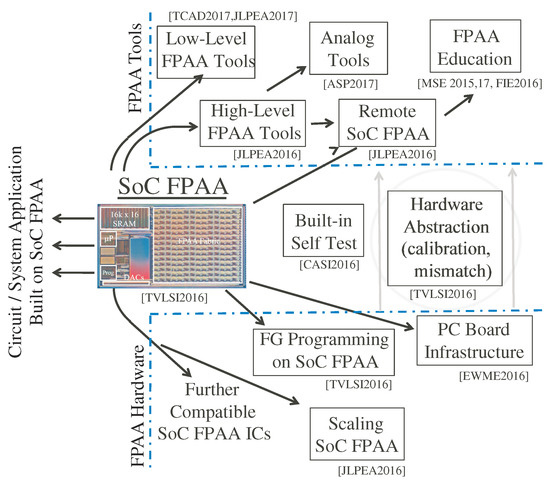 Figure 3 shows a high level view of the demonstrated infrastructure and tools for the SoC FPAA, from FG programming, device scaling, and PC board infrastructure, through system enabling technologies as calibration and built-in self test methodologies, and through high level tools for design as well as education (e.g., [20,21]). High-level design tools are implemented in Scilab/Xcos that enable automated compilation to working FPAA hardware [22]. These tools give the user the ability to create, model, and simulate analog and digital designs. These tools utilize abstractions in a mixed analog–digital framework [9], as well as development of high-level tools to enable non-device/analog circuit designers to effectively use these approaches [22] (Figure 3).