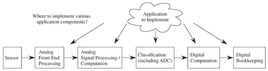 This new capability creates opportunities, but also creates design stress to address the resulting large co-design problem (Figure 4). The designer must choose the sensors as well as where to implement computation between the analog front-end, analog signal processing blocks, classification (mixed signal computation) which includes symbolic (e.g., digital) representations, digital computation blocks, and resulting P computation. Moving heavy processing to analog computation tends to have less impact on signal line and substrate coupling to neighboring elements compared to digital systems, an issue often affecting the integration of analog components with mostly digital computing systems. Often the line between digital and analog computation is blurred, for example for data-converters or their more general concepts, analog classifier blocks that typically have digital outputs. The digital processor will be invaluable for bookkeeping functions, including interfacing, memory buffering, and related computations, as well as serial computations that are just better understood at the time of a particular design. Although some heuristic concepts have been used, far more research is required in building the application framework to enable co-design procedures.