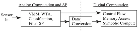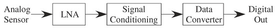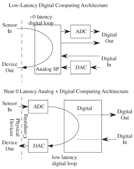 Classical analog design focuses on providing as high as possible an SNR representation of the incoming or outgoing signal. Figure 5 represents half of all of those architectures going from sensor to digital representation. A digital representation to physical actuator is a straight-forward block diagram reversal. The core computation is performed in Digital Signal Processing (DSP), utilizing the programmable computational framework available in digital computation. Figure 5 architecture is consistent with classic DSP (e.g., [29,30]) and analog system design (e.g., [31]), reinforce these viewpoints as standard practice and taught in most classes.