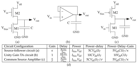 where the is tuned through a single current source transistor in the TA. Figure 6 summarizes important large-signal solutions, with time constants solved through linearization [35]. The common-source configuration has gain greater than 1, and the delay for the increased gain increases proportionally. The product of Power–Delay–Gain is constant across most subthreshold analog circuits.