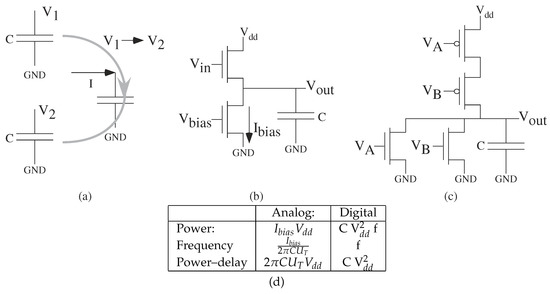 Energy and Power are proportional to capacitance load (C). Power equals energy for a single operation times the frequency of the operation. (a) Computation requires moving between one voltage () to another voltage (), likely returning back to a baseline (e.g., ) after the computation is finished. (b) Energy and Power are proportional to C, where the bias current () is set to operate at a particular frequency. Higher computation frequency results in proportionally higher . Analog biased near lowest , and typically that allows the circuits to be used for filtering (e.g., ). (c) Energy is proportional to C, typically a function of other digital gate inputs and routing to other digital gates. Power is energy to raise and lower the output gate signal times the frequency of the computation. Digital charging current is at the maximum level, but otherwise requires only a smaller static current. (d) Basic circuit (e.g., gate) level consideration of power and operating frequency (f), and power–delay (power/f) or single operation energy. At a single element level, devices have constant power–delay products, where power–delay is proportional to load capacitance, and a product of voltages.