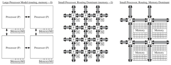 The delay of a digital computation, particularly a parallel digital computation, requires analyzing delays in processing as well as delays in computation. These questions exist for single processor digital systems, but practically one only deals with computation issues since any communication (e.g., memory) is already incorporated into the processor cost. Parallel digital architectures find a fundamental break when the processors dominate the complexity metrics and when the routing dominates the complexity metrics [1]. When the processors with local memory access require more effort than the routing infrastructure between processors, one assumes the first case, and only when the processors become small would one consider the routing delay. In practice, one almost always assumes the processors dominate the complexity metrics, including when discussing parallel architectures as well as array architectures (Systolic, Wavefront) [1,41,42,43,44]. One might consider This case the large processor assumption, illustrated in Figure 8, where the processor complexity is larger than anything else. One assumes other issues are negligible, or rather requiring the processor design to settle these issues and constraints so not to burden the system architect. As technologies scale, the processor design goes through additional stress to satisfy these larger constraints.
