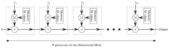 Computation flow for Vector-Matrix Multiplication (VMM) operations in a one-dimensional mesh of digital processors. Adding N numbers requires O(N) time, and M different coefficients requires O(M) time for each processor for memory access. If pipelining at each stage is used, one can get a new output result in O(1) time.