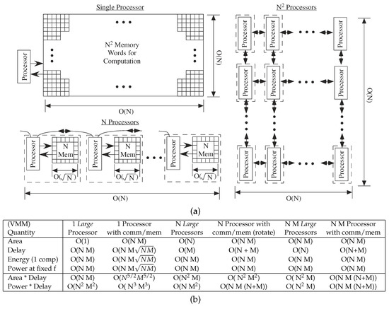 Digital VMM computation. (a) Computational Flow for computing an N × N VMM operation using 1, N or N processors. The coefficients memory requirements impact the complexity. A two-dimensional surface is assumed typical of Integrated Circuit (IC ) design. (b) Metric summary for a N × M VMM using for 1, N, and N × M processors. The contrast between classic VMM computational metrics (Large Processor) and architecture metrics including communication and memory access shows different perspectives between single and parallel processing computation complexity.