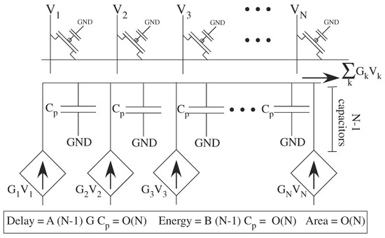 Analog computation is the extreme case off small processors with very local memory. In some cases, the analog computation is embedded into the memory, at nearly the size of memory, becoming the extreme of computing in memory approaches. The processors can be FG memory elements [6] , similar to flash memory devices. A dense FG transistor array implementation (Figure 13) is the original computational crossbar network [5]. The transistors can be used for multiplication or temporal–spatial filtering. Each transistor current is summed together for the output, providing an ideal summation (e.g., for a VMM computation) on a single routing line. The line capacitance (C) sets the power and energy consumption. The product of the linearized transistor conductance (G, G, ... , G) and the capacitance sets the delay. The area is the area of the transistors and routing lines.