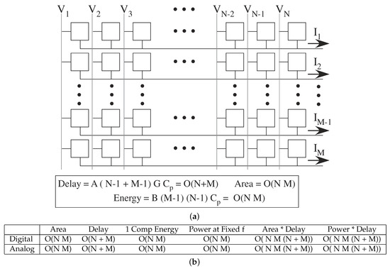 VMM provides a connection between digital and analog parallel architecture theory (Figure 14). Analog VMM computation is implemented as a mesh architecture [3], where inputs are broadcast voltages, and the computed products result from summing output currents. Analog VMM with O(N × M) processors would have O(N + M) delay time because of increasing delays (capacitance) for longer lines. The conductance driving the broadcast input lines must drive O(N + M) capacitance, and the conductance of the multiplication element (input * weight) must drive O(N) capacitance. The case is analogous to accessing a digital memory array for resulting coefficients, and no surprise, the resulting order of complexity is also similar. The coefficients in front of O( ) will be significantly smaller for the analog approaches compared with digital approaches (e.g., 1000× in energy efficiency).