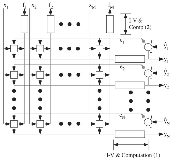 Figure 15 shows a typical architecture for LMS linear or nonlinear adaptive filter layer (e.g., [4,47]) implemented in a mesh architecture. This layer is the key building block for adaptive neural networks, neural networks using back propagation, machine learning, and deep networks. VMM computations are performed to compute the output signal (y, y, ...., y) and the error signal for the previous layer (f… F), as well as outer product multiplication and integration of two orthogonally broadcast signals. Often the complexity of the potential architecture relates to the capability of the physical computing devices. Silicon CMOS provides a rich blend of potential devices and computations, although two-terminal crossbar devices will often be significantly limited by the device capabilities. A wide range of analog parallel architectures project onto such a mesh of processors. Further, given the small size of the analog processors, a single processor can be compiled into a computing block in a reconfigurable system (a Computational Analog Block, or CAB), utilizing the Manhattan routing infrastructure to directly communicate between processors in a mesh array.