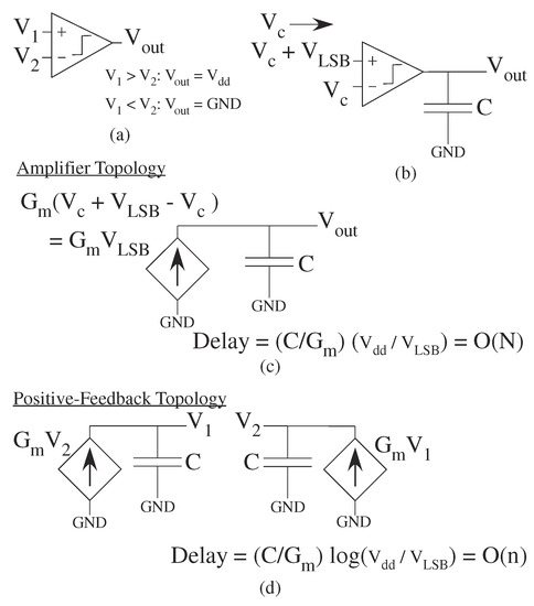 Comparators are an essential ADC component classifying one signal as bigger or smaller than another signal (Figure 16). A comparator is an analog device that takes two inputs, either voltage or current, that outputs a signal at V if one signal is larger, and outputs a signal at GND if the other signal is larger (Figure 16a). A differential amplifier or op-amp can serve as a comparator device, although an analog designer typically would specialize the circuit for the comparator function. Important comparator metrics are the gain of the comparator (greater than V/V), and the speed of the comparator, the time it takes for the comparator to charge a load capacitor (Figure 16b). The requirement for unity-gain stability of an op-amp is not typically required, although classical transconductance (G) based approaches are often used (Figure 16c). Some comparators use positive feedback, similar to digital latches, to quickly amplify a small input signal difference (Figure 16d). A comparator for an ADC without positive feedback requires O(N) delay (Figure 16c), verses an ADC require O(n) delay (Figure 16d). The comparator circuit depends on the particular ADC architecture scaling. The comparator bias current sets the speed and energy consumption; subthreshold bias current results in a constant comparator power-delay product.