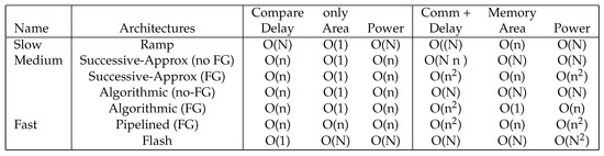 ADC architecture uses a large-processor formulation considering only the number of comparators required. Communication, memory access, as well as other issues are typically assumed to have a small affect. The architecture analysis used primarily counts the complexity of comparators, or number of comparisons, used for a computation. As a result, ADC architectures are categorized as slow, medium, or fast based if delay from comparisons is O(N), O(n), or O(1), respectively (Figure 17). Slow, medium, and fast ADCs tend to require O(1), O(n), and O(N) comparators, respectively, along with the associated area and possibly energy consumption. Some medium speed ADCs require O(1) comparators that are reused by the computation. A number of ADC architectures span the space between Medium and Fast converters, particularly architecture to pipelined ADC architectures.
