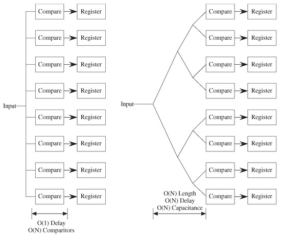 Architecture diagram for a Flash ADC architecture, first assuming the classic ADC architecture, and second showing the effect of input routing trees. comparators are typically considered the important item. The input must be routed to avoid delay between outputs; the output is routed as a tree structure to have equal delays between all elements. Other tree structures are used, as in clock routing and other timing issues.