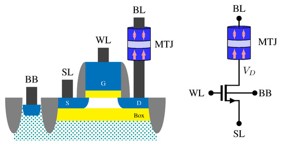 - Fong, X.; Kim, Y.; Choday, S.H.; Roy, K. Failure mitigation techniques for 1T-1MTJ spin-transfer torque MRAM bit-cells. IEEE Trans. Very Large Scale Integr. Syst. 2014, 22, 384–395. [Google Scholar] [CrossRef]