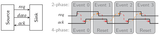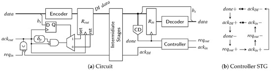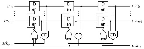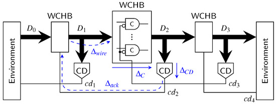 28) is compared to the cycle time of the WCHB pipeline (Equation (26)), it can be seen that the expressions are very similar. The only difference is the delay for the additional XNOR gate (assuming
