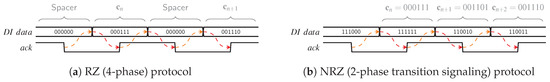 . Even if the signal wires between two pipeline stages have the same geometrical dimensions and the same driver strength is used, it makes a difference whether an RZ or NRZ protocol is used. If neighboring wires of a bus switch in opposite directions capacitive crosstalk effects [