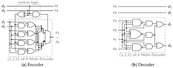 The synthesis results and area estimations in this section are generated using the NanGate 45 nm Open Cell Library. However, to abstract away from the library details, we use the gate equivalents (GE) metric, which relates the actual area to the one of a single 2-input NAND gate. Encoders and decoders have been synthesized from VHDL descriptions with the Synopsys Design Compiler, with high effort on area optimization (we only consider the pre-layout results for our analysis). The CDs are already generated on the gate level by our CD construction approach, hence no logic synthesis is required to estimate their area overhead. Since the library does not contain C gates, we assumed an area overhead of 3 GE (12 transistors) for a 2-input version of this gate [