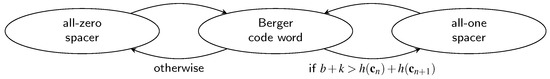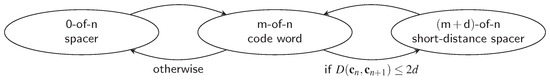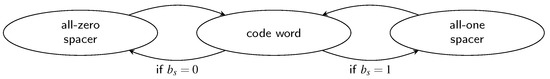 p denotes the percentage of cases in which the special spacer is used, which can either be estimated using Equation (18) or be calculated exactly by considering the actual code word set. For the cases where the input of the CD transitions from the all-zero spacer to a code word (or vice versa) the normal depth
