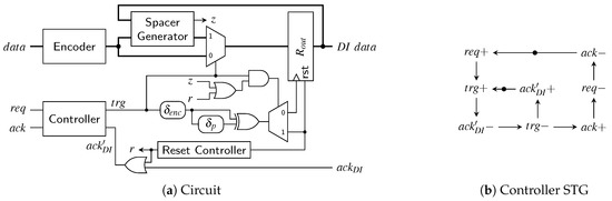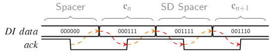Generally it can be concluded that will only be marginally larger than , since the delay of an m-input OR gate (for the second-level 1-of-m CD) will certainly not exceed the delay of an m-input C gate. If the delay of the OR gate is significantly lower it can even compensate for . For higher values of d it strongly depends on whether the smaller C gate in the SD spacer path is sufficiently faster than the m-input C gate in the regular path to make up for the increased CN delay .