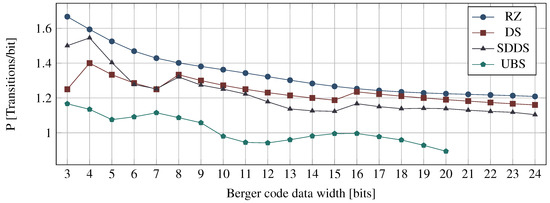 It can be seen that for all codes the hop costs for the NRZ protocol are the most expensive. However, with greater initial costs the cheaper CDs of the SDS and UBS protocols often only pay off after a certain amount of pipeline stages. The DS protocol performs quite well, as it only requires a little more hardware investment than the RZ protocol and still improves the power metric quite significantly (see bars on the right-hand side), especially for codes with a small bit width. When the PSCWCs are compared to the Berger codes it can be seen that the higher initial costs for encoding and decoding pay off after just a few hops, regardless of the protocol.