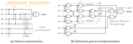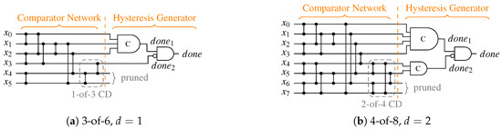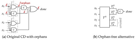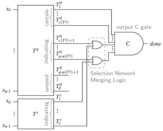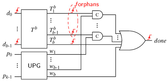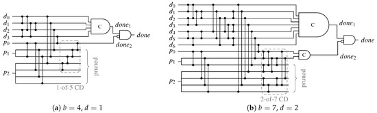 Notice that in the case where (i.e., in the case where Berger codes offer the best coding efficiency), both C gates have the same number of inputs. In this case, the only difference to is the delay of the output AND gate. In all other cases we have that , which (depending on b) can significantly worsen the delay of the CD.