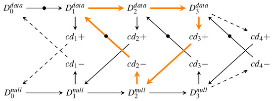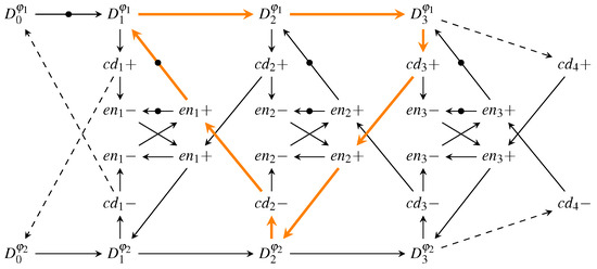 Again, the longest cycle is marked orange and the resulting cycle time expression is shown in Equation (27).