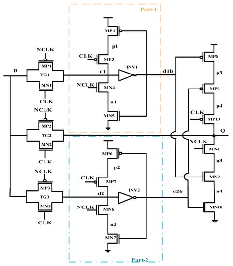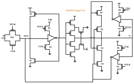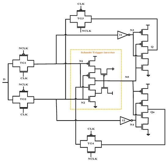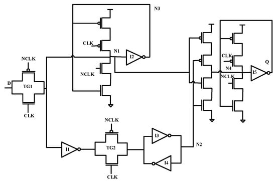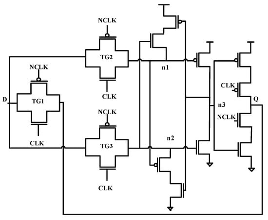 The proposed low power and high speed (LPHS) soft error hardened latch circuit is shown in Figure 8. In the circuit, the data input D is separated into three nodes and connected to three transmission gates (TG1, TG2 and TG3).