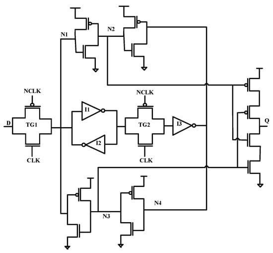 As technology scales down, devices have become increasingly vulnerable to high energy particles. This makes the issue of circuit reliability a significant concern for circuit designers. The amount of charge that can be deposited on a node is also decreased owing to the voltage reduction and node capacitance, rendering the system vulnerable to induced charge due to a high energy radiation particle strike. If the quantity of accumulated charge is sufficiently large, a momentary fault occurs as an electrical pulse called a Single Event Transient (SET). Additionally, the current caused by a high energy radiation particle strike flows through a p-n junction, from n-type to p-type diffusion [,,]. This indicates that if a latch is comprised of only P-channel Metal Oxide Semiconductor (PMOS) transistors, the node voltage cannot alter from 1 to 0 when the radiation particle strikes []. Similarly, the node voltage cannot change from 0 to 1 if the latch is comprised of only NMOS transistors. A Single Event Upset (SEU) occurs on memory cell or latches when the SET propagates through combinational logic circuits.
