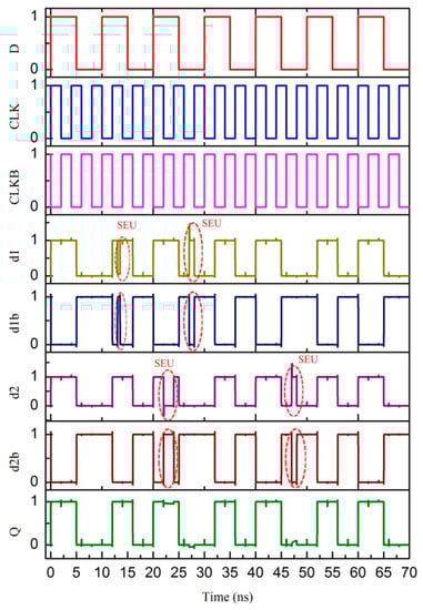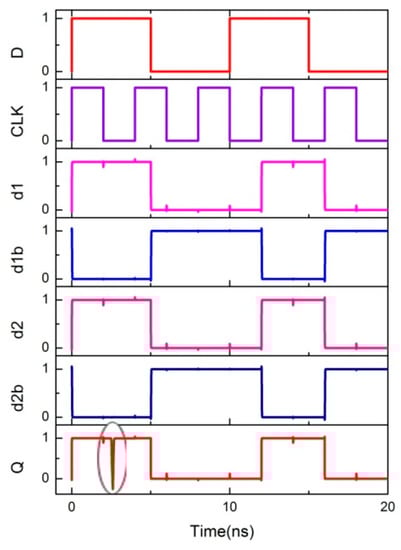 In the above Equation (1), I (t) denotes transient current pulse; where Tα denotes collection time constant; Tβ denotes ion track establishment constant and Q = Total deposited charge. Though Tα, Tβ are technology dependent parameters, in [,,,] with different technology, considered the same values of Tα and Tβ i.e., 0.164 ns and 0.05 ns respectively. For our proposed design the same values are chosen. In order to examine the performance of LPHS latch, its area, delay, power and power delay product (PDP) are calculated. These results are compared with the latches reported in the literature and the same is shown in Table 2. In general, the total power consumption consists of two components, static and dynamic power consumption. Dynamic power is the significant component of power consumption. Switching activity, supply voltage, node capacitance and the feedback loop is a primary factor in dynamic power consumption. The LSEH-1, LSEH-2 and NAN2 latches have more switching activity in transparent mode, allowing them to alter the value saved on node capacitance for longer time. LPHS latch has solved these issues by adding a clock gating circuit to decrease the switching activity and by cutting off all unwanted feedback loops. Consequently, the power consumption of the LPHS latch improves by 84.09%, 85.48%, and 83.45% compared to LSEH-1, LSEH-2, and NAN2 latches, respectively. Similarly, the feedback loop and the weak keeper of EVFERST latch leads to exhibit 62.5% more power dissipation as compared to the LPHS latch. Though, the RFEL latch do not have the active feedback loop in transparent mode, it has slightly increased power, i.e., 8.2% more than the LPHS latch, due to a greater number of transistors used in the circuit configuration. The active feedback loops in transparent mode and a week keeper circuit at the output also increase the propagation delay. The propagation delay of the LPHS latch is reduced by 95.9% 98.8%, 30%, 98.3%, and 94.7% as compared to LSEH-1, LSEH-2, NAN2, EVFERST, and RFEL latch, respectively. From Table 2, it can be observed that the EEST latch shows better performance than the other latches including the proposed LPHS latch. However, the EEST latch shown in Figure 7 is not completely immune to SEU if a positive upset pulse due to particle hit at node n3 occurs.
