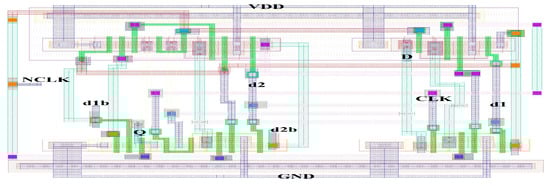 Figure 10 shows the TF occurrence at output node Q. The TF caused by radiation particle strike at output node Q produces a glitch and remains until the effect presents at the node. Nodes d1 and d2 preserve their actual states, implies that the particle hit on Q can only influence Q by placing a wrong value on it. Figure 11 displays the layout of the LPHS latch.