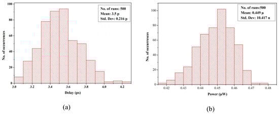 This section addresses the effects of process, supply voltage, and temperature variations (PVT) on the LPHS latch. Monte-Carlo (MC) simulations has been carried out for 500 runs using Cadence Spectre and presented the results in Table 3. The power and delay of LPHS latch is simulated under various process corners such as typical (tt), fast (ff) and slow (ss) for varied supply voltages (±10% of VDD), and the temperature ranges from 0 °C to 100 °C []. From Table 3, it can be observed that the power consumption increases with the increase in supply voltage because high supply voltages offer high noise margins []. Consequently, the noise level to influence the circuit increases. Nevertheless, the D to Q delay decreases due to increase in the supply voltage, because high supply voltages influence high currents into the device. Table 2 also shows the deviation in power consumption and delay for various temperatures.