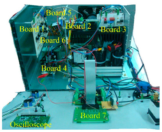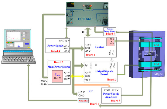 Conversely, to others, this FFC relaxometer [10,11,12], in addition to the circuits referred above, includes a Hall effect sensor that is placed inside the magnet, in the same section of the sample holder, i.e., the magnetic poles. The output of the Hall sensor is connected to the control system allowing for a direct control of the magnetic flux density. In Figure 2, a picture of the boards inside of the power supply housing is shown.