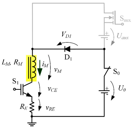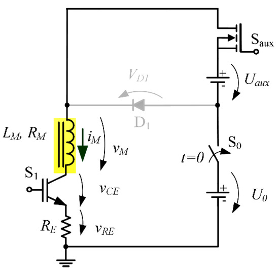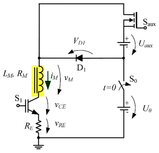 In Figure 4, the topology of power circuit is presented. The main elements are: A power semiconductor, , insulated gate bipolar transistor (IGBT type) together with an emitter resistor, , a low voltage source, , an auxiliary power supply, , a switch, , metal oxide semiconductor field-effect transistor (MOSFET type), a diode, , and the magnet characterized by its inductance and resistance, , , respectively. The switch, , corresponds to a general switch.