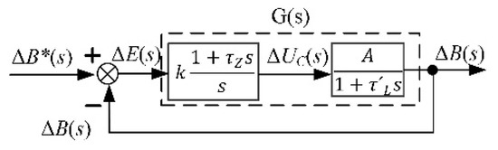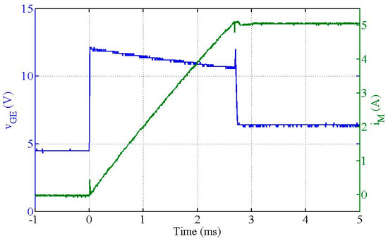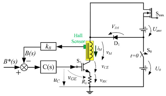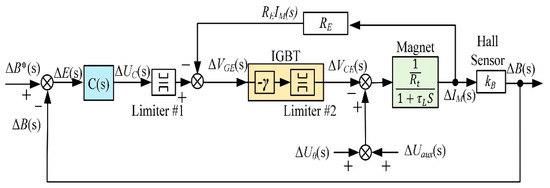 In Figure 8, C(s) represents the controller’s transfer function and the gain of the Hall effect sensor. The gate–emitter voltage () is used to adjust the collector–emitter voltage () of the IGBT (S1) and consequently control the magnet current ().
