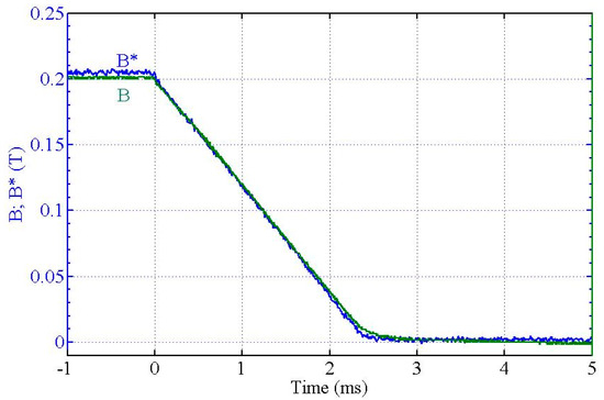 Analyzing the previous results of the “Up” transitions of the magnetic flux density, it can be concluded that it develops according to the requirements of the FFC-NMR purpose. It is important to note a minimum magnetic flux density overshoot, which is the major requisite for this application. Additionally, for the “Down” transition, the observed dynamics are within the limits imposed by the FFC-NMR measurement conditions [1,3,6]. These results are directly related with the control circuit and the command voltages of the control chain.