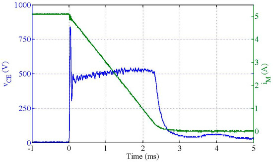 Figure 14 presents the experimental results of the collector–emitter voltage of the IGBT during “Down” transition.
