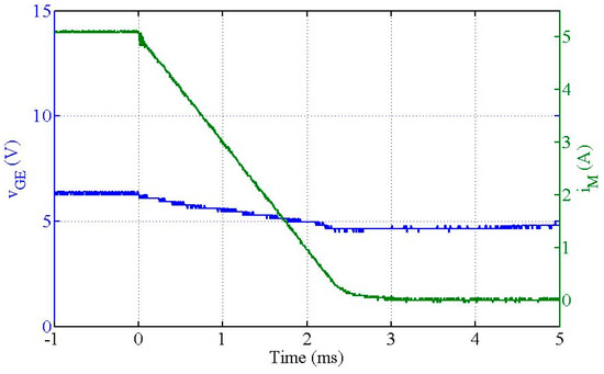 The transition from the high ( or ) to a low magnetic flux density level (), is performed taking advantage of the collector-emitter voltage drop of the IGBT semiconductor. The voltage in the active region of this semiconductor can be expressed by [20,21]: